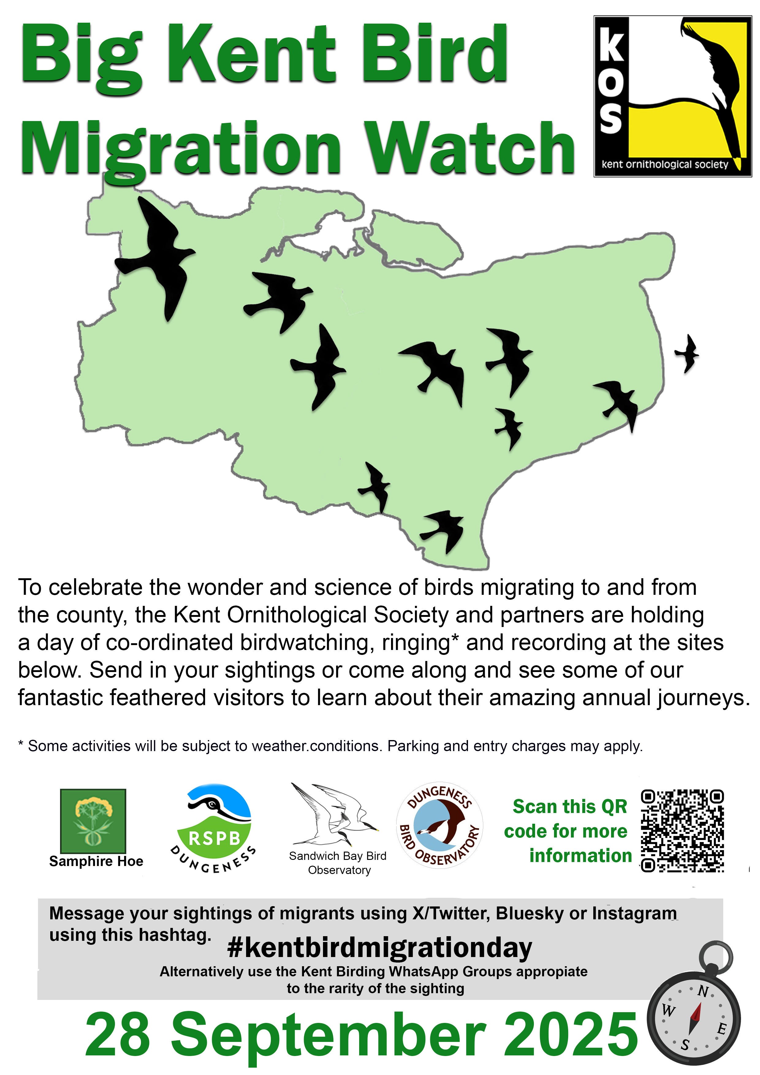 Send in your bird sightings (particularly of migratory species) in Kent. Sightings can be sent in via X/Twitter or Instagram using the hashtag - #kentbirdmigrationday or alternatively use the WhatsApp group appropiate to the rarity level of the sighting.